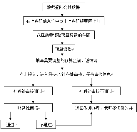 请注意教师科研经费网上申办理需及时提交,社科处审核后,财务处审核及做帐。审核不通过的内容,教师应及时修改并确认,以免耽误后面的进程。待该项目审批状态显示为“财务处通过”后,可到财务处使用经费了。
