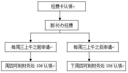 财务处每周三上午制作新的科研经费卡。新近人员、无科研经费卡的,只要在该时间点前通过了网上经费认领手续,就可在每周四起,凭校园卡或工作证到财务处中山北路校区办公楼106室领取经费卡。