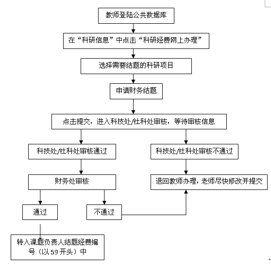 已顺利通过验收的项目,在审计通过(不审计项目除外)后,可在公共数据库科研经费办理申请财务结题,财务结题后,项目经费会自动转入课题负责人的结题经费编号(以59开头)中。