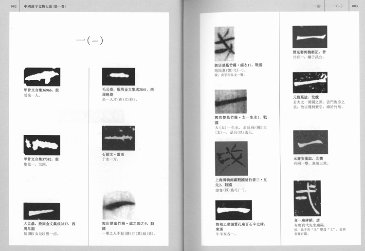 There are 15 volumes with the last volume as appendix, including the phonetic and stroke-based search system, the pictures and names of the cited relics and bibliography. The first 14 volumes, threaded by the 540 radicals listed in Shuowen Jiezi, recorded all the original forms of characters appearing in relics dating back to Pre-Qin period till Tang Dynasty. In total there are 4344 characters and 45562 different forms. The relics cited in the book are diversified and representative, including oracle bones, bronze wares, potteries, currencies, bamboo and silk strips, carved stones, residue of papers, etc. Beneath every character form is presented the name of the relic, its quotation, time and interpretation of the context where the character appears. For certain character forms which reflect the very development of itself, the editor adds a brief introduction. When all the different forms of one character are listed, the editor also add a brief summary of the change in its form and meaning. In order to render a more vivid perspective to the readers, in every volume there are about 200 colorful pictures of the relics, illustrating a large variety of writting materials from oracle bones, bronze wares to bamboo strips and silk, to stones and papers, for Chinese characters.
